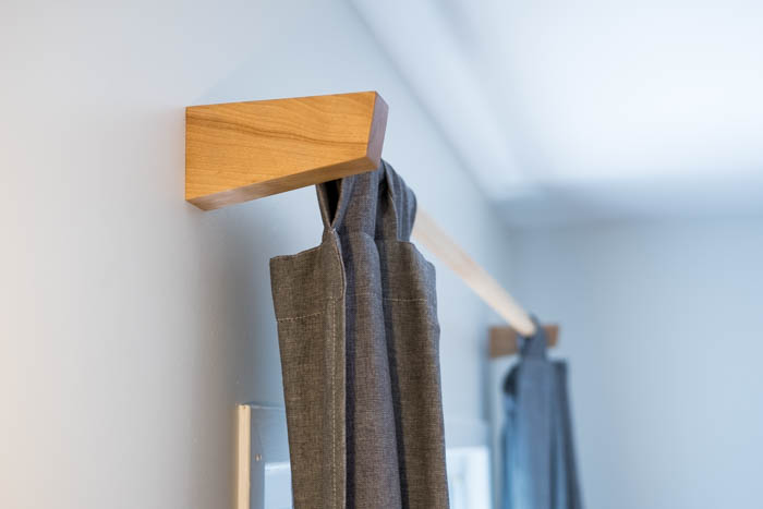I find most curtain rods and brackets make use of ugly metal parts so I set myself to build my own wooden ones.